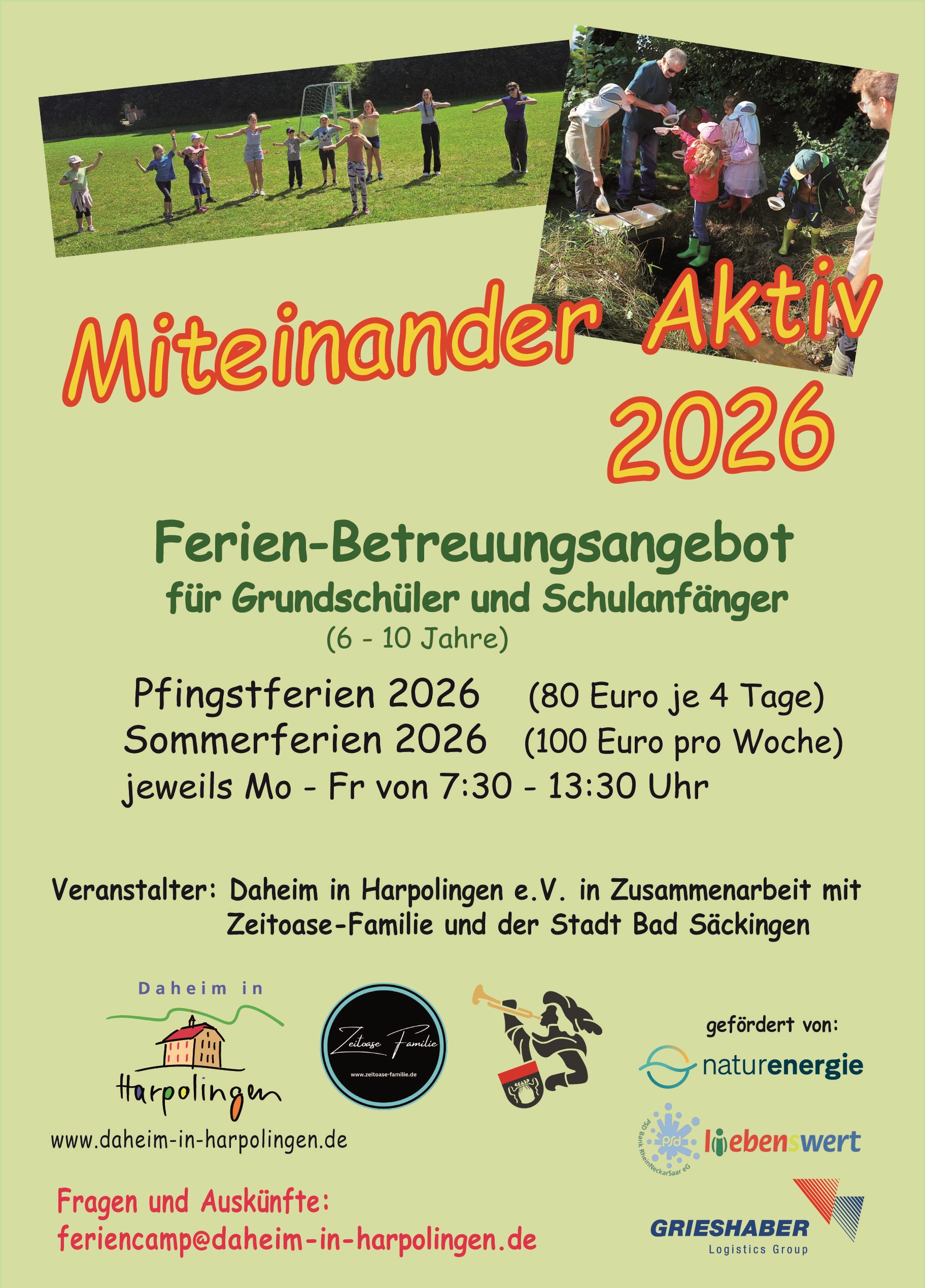 Dank der finanziellen Unterstützung durch ortsansässige Firmen und private Spender kann unser beliebtes Ferienprogramm "Miteinander aktiv" auch in 2026 durchgeführt werden!