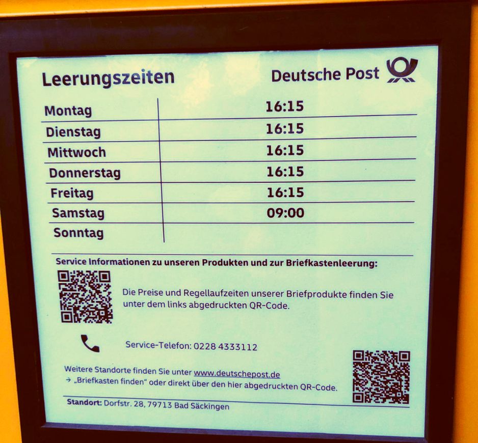 Die Leerungszeiten des Briefkastens am Rathaus (Dorfstr 28):