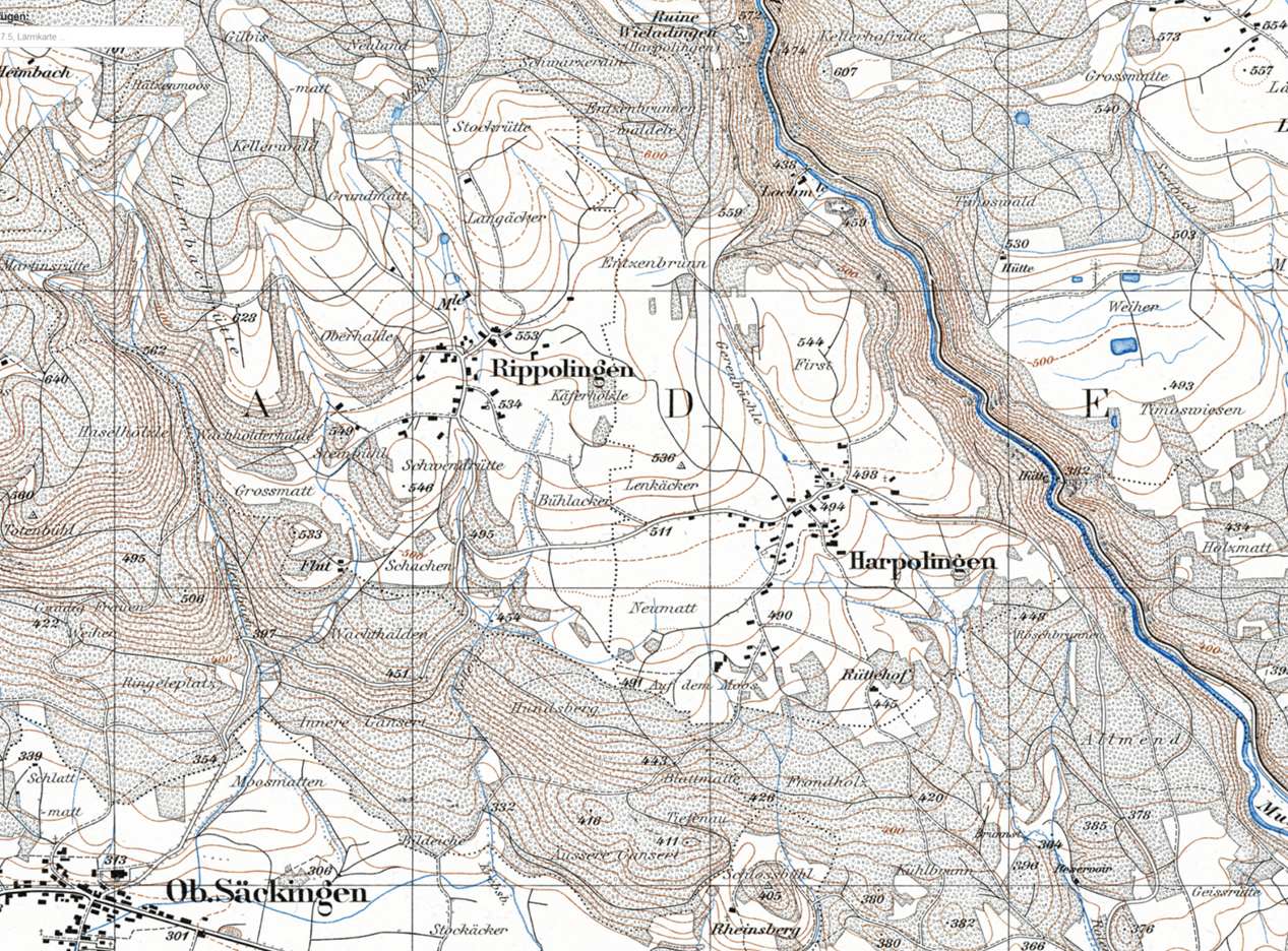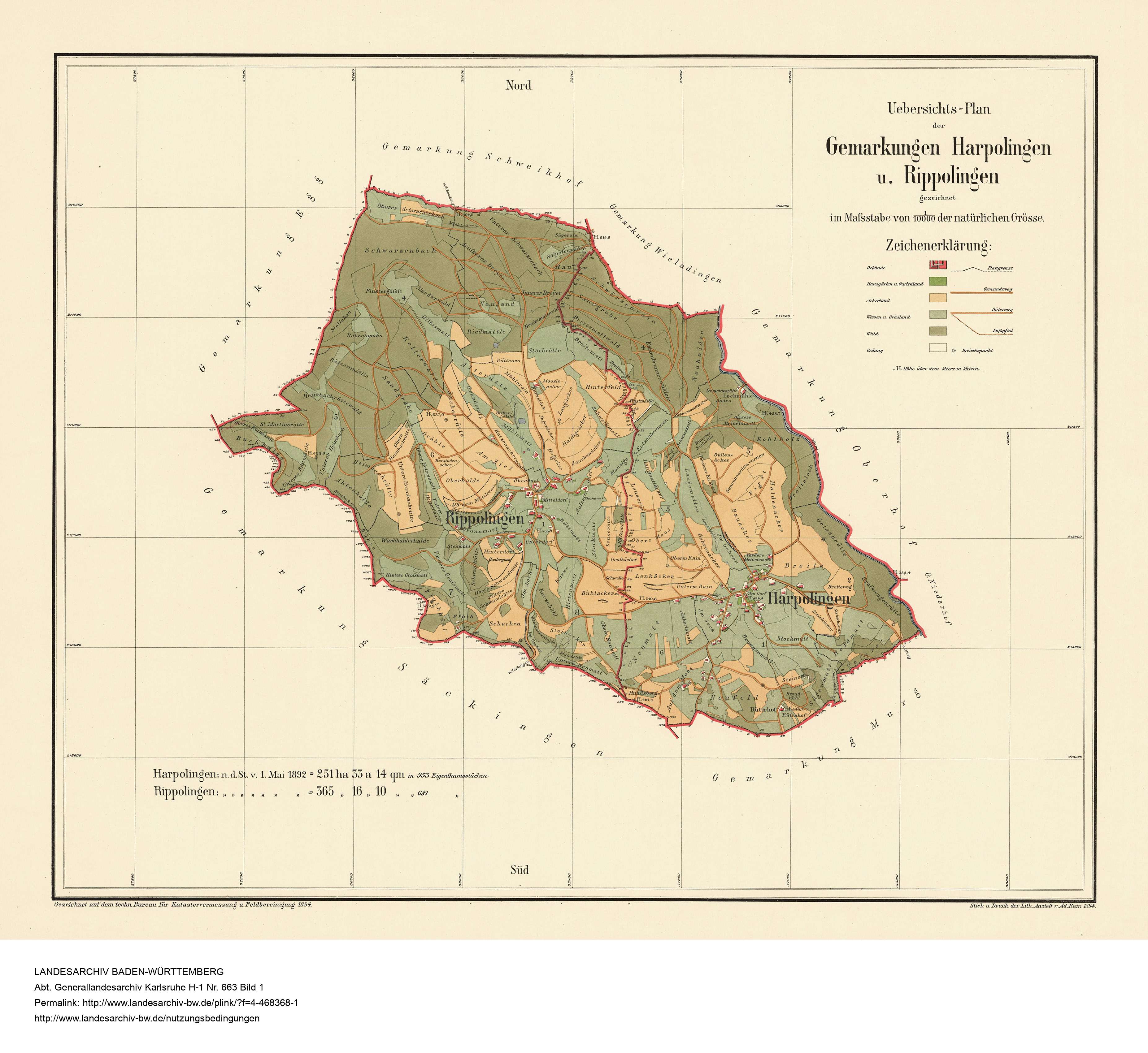 Dieser Gemarkungsplan von Harpolingen und Rippolingen von 1892 befindet sich im Landesarchiv Baden-Württemberg, Abt. Generallandesarchiv Karlsruhe. Er kann online hier eingesehen werden.