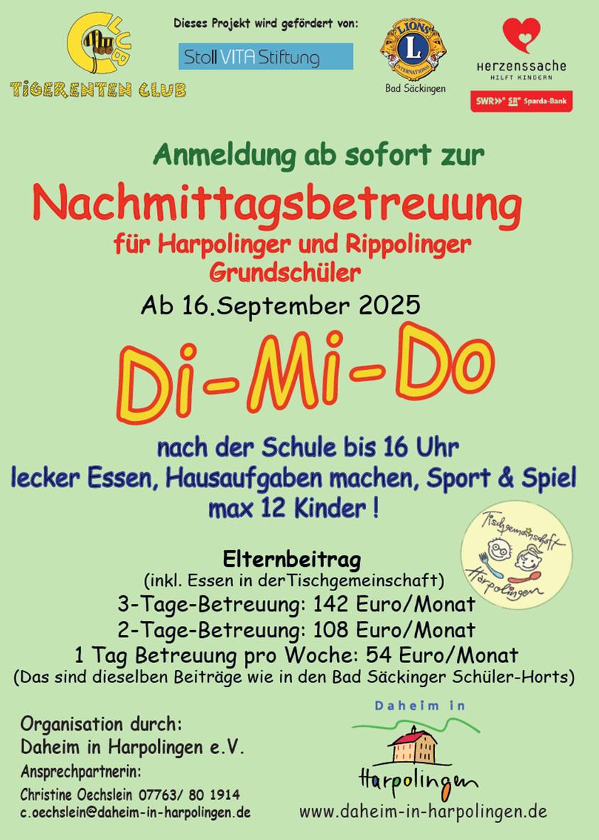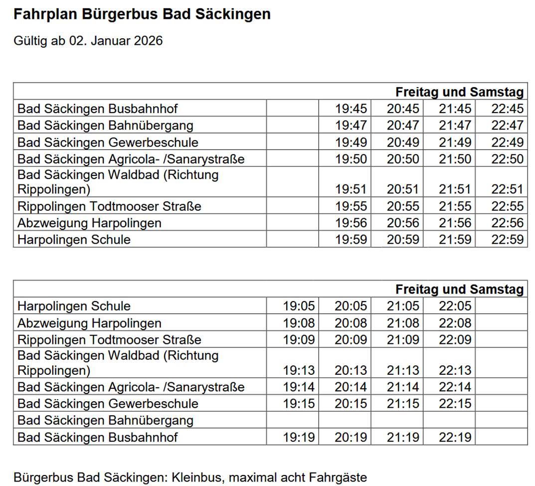 "Mögliche Einrichtung eines ehrenamtlich getragenen Bürgerbusangebots zur besseren ÖPNV-Anbindung der Teilorte Rippolingen und Harpolingen" beraten. Wer interessiert ist, an einem entsprechenden Konzept und an dessen Umsetzung ehrenamtlich mitzuwirken, meldet sich bitte baldmöglichst bei der Bad Säckinger Stadtverwaltung oder der Harpolinger Ortsverwaltung. Es werden auch noch ehrenamtliche Fahrer gesucht !