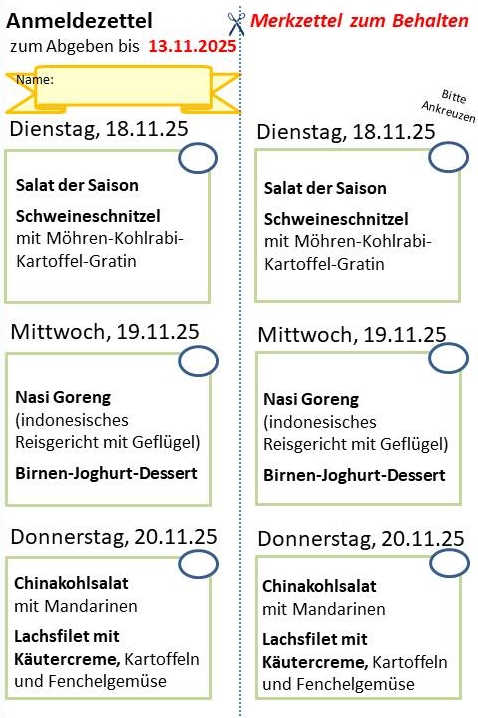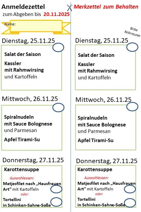 Und für diese Tage / Speisen kann man sich aktuell anmelden: